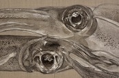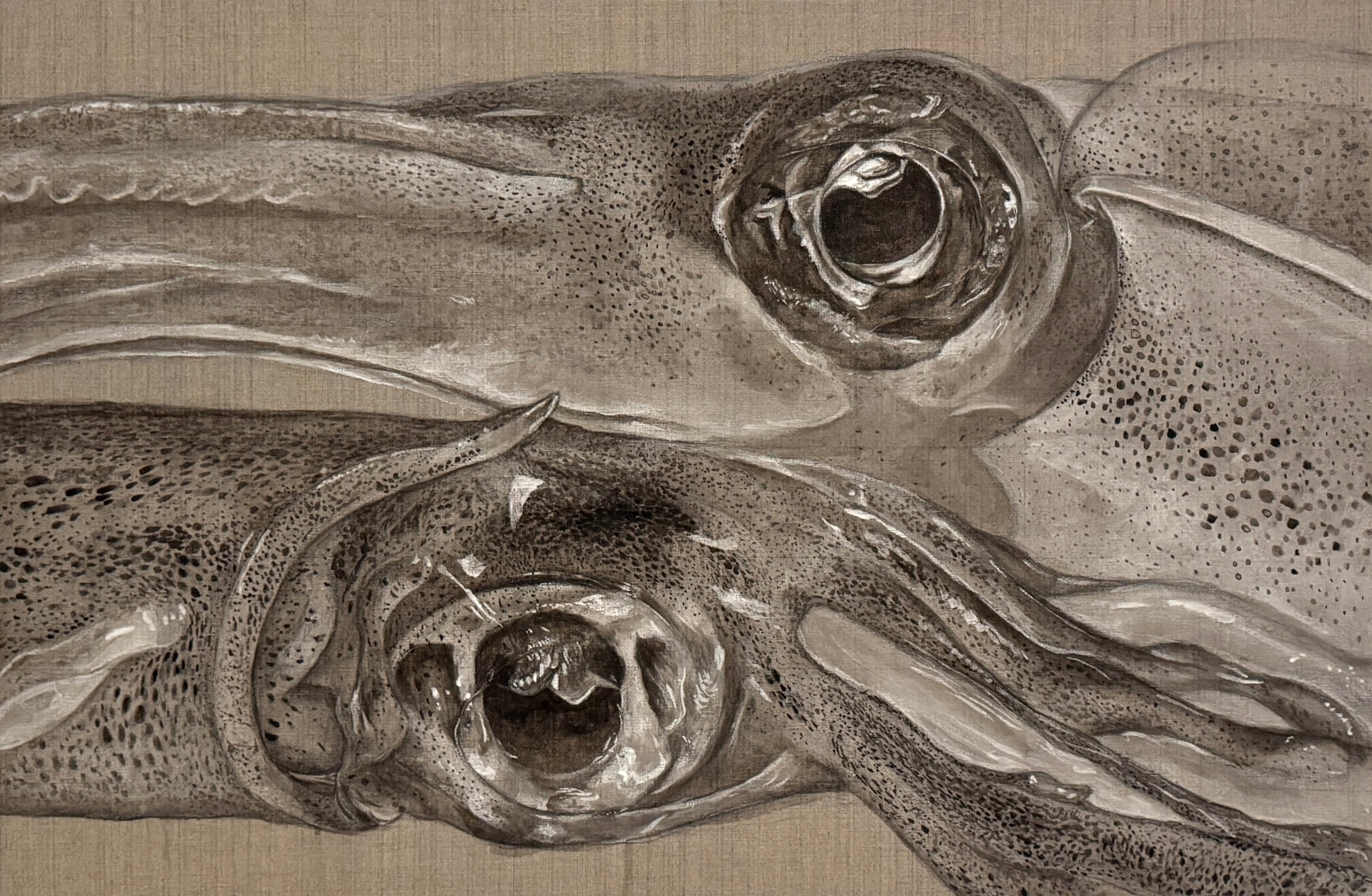 キャンバス、アオリイカの墨、イカ胡粉、アラビアゴム
