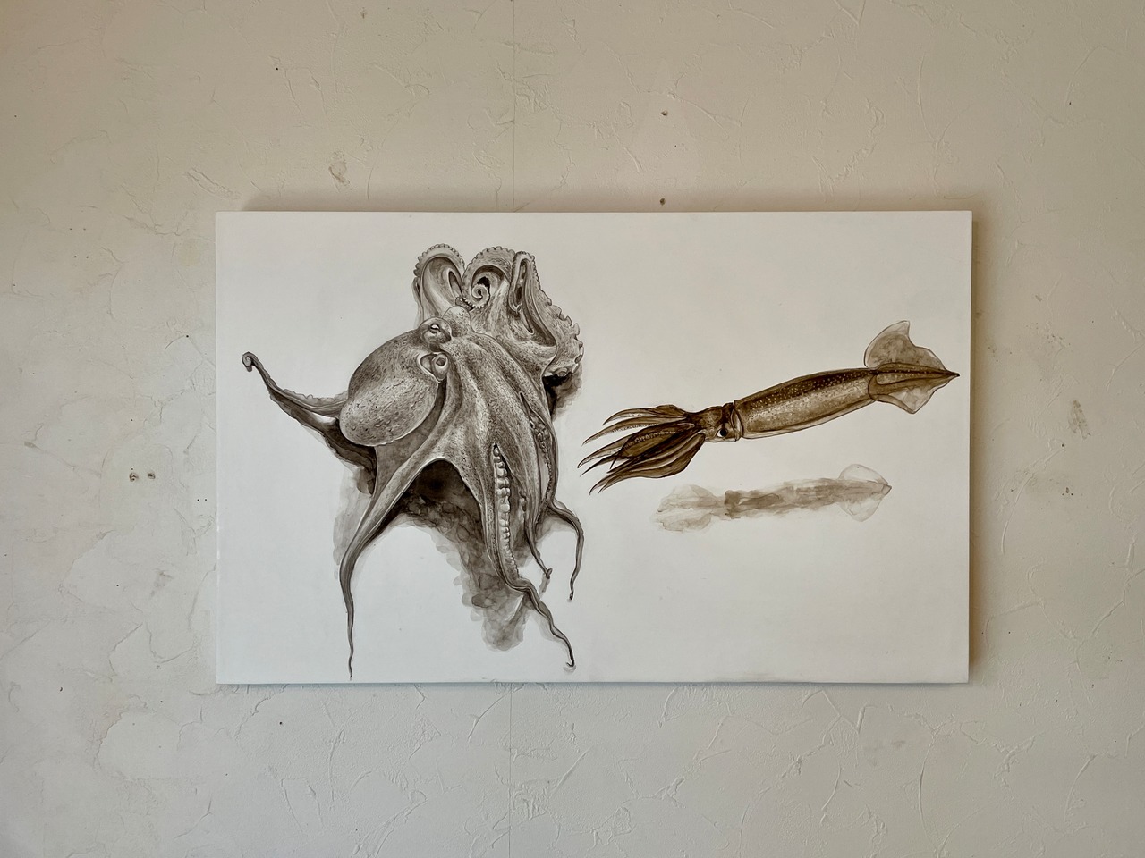 Wood panel, gesso, ink from Japanese flying squid, ink from common octopus , gum arabic