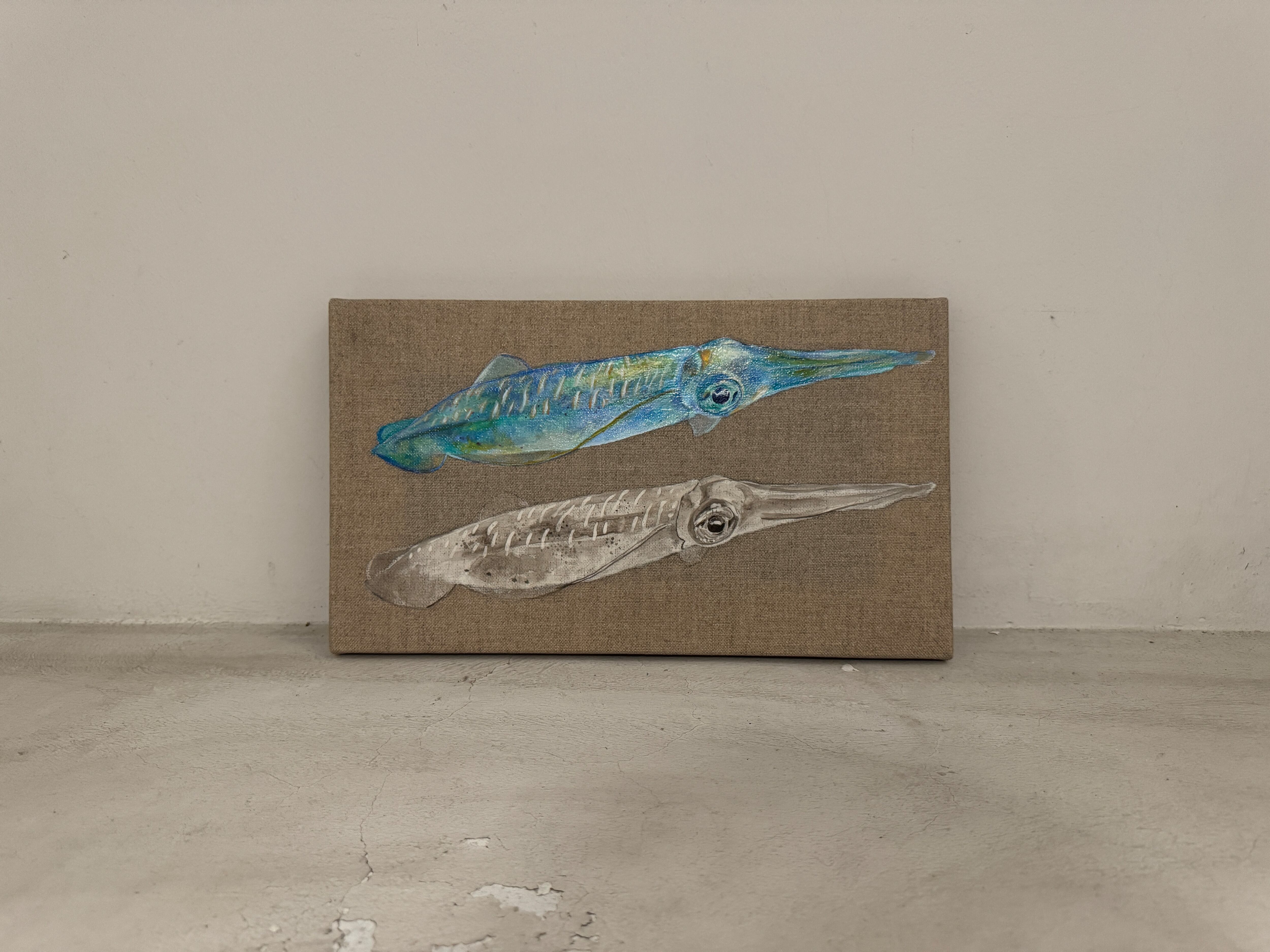 キャンバス、油彩、アオリイカ墨、イカ胡粉、アラビアゴム